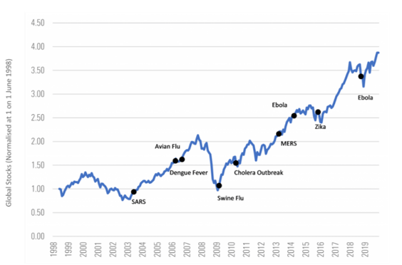 Over time though, we’ve seen that markets are resilient against global epidemics. Even if the immediate impacts cause a temporary fall, the long-term trend is positive: